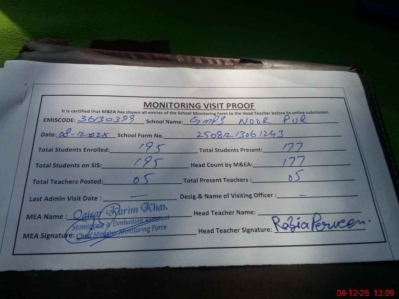 | Attendance Register | Head Teacher | MEA with School | Visit Proof |