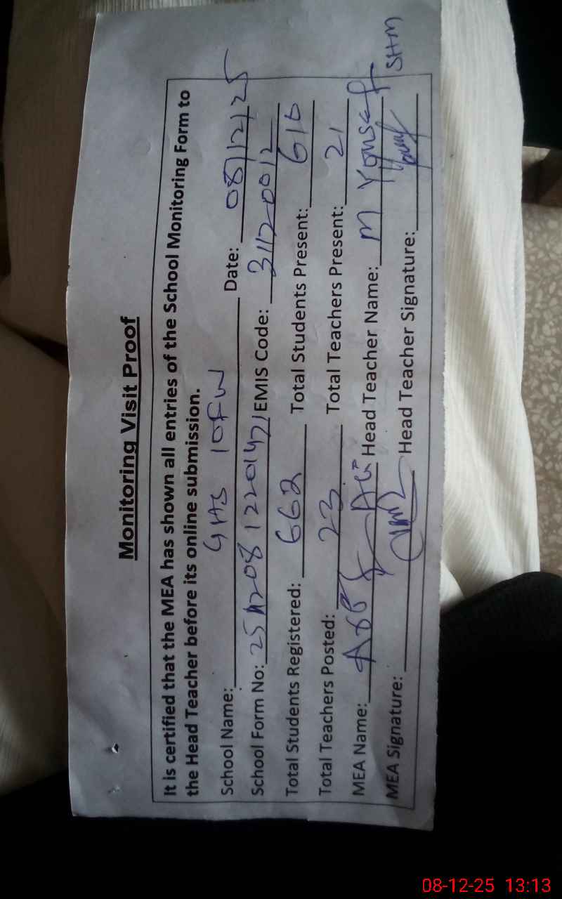| Attendance Register | Head Teacher | MEA with School | Visit Proof |
