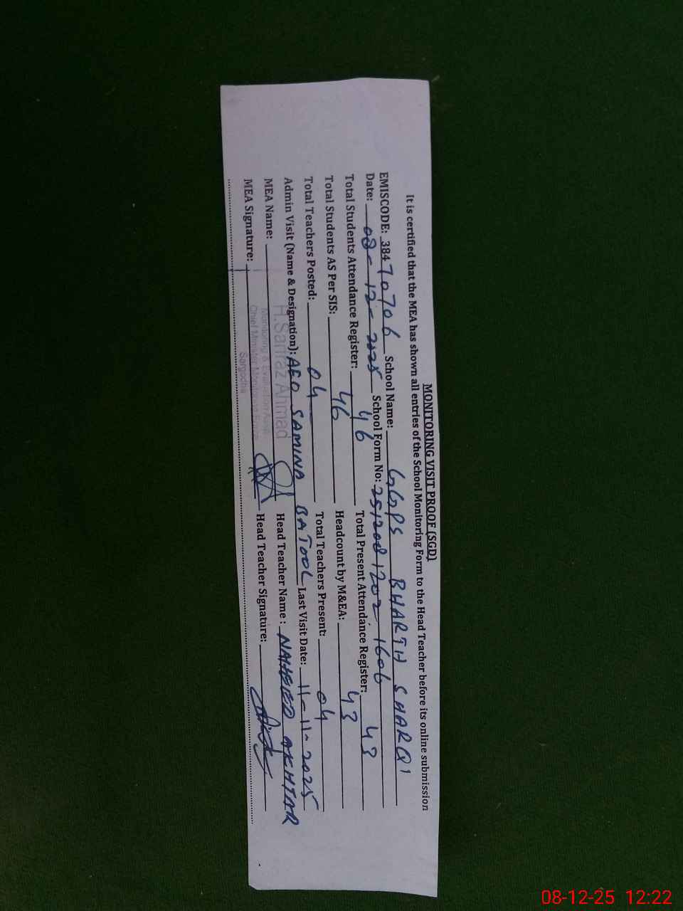 | Attendance Register | Head Teacher | MEA with School | Visit Proof |