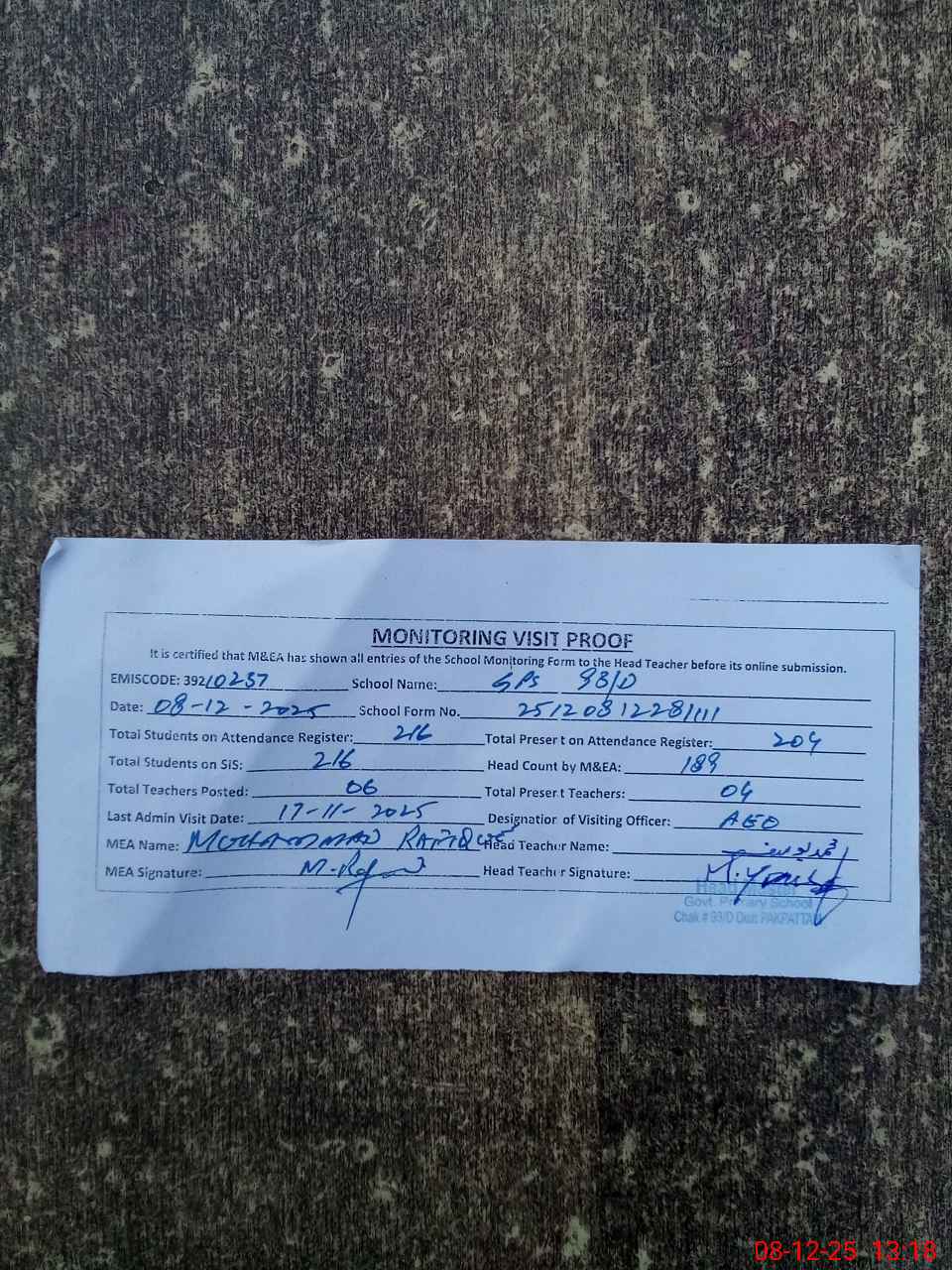 | Attendance Register | Head Teacher | MEA with School | Visit Proof |