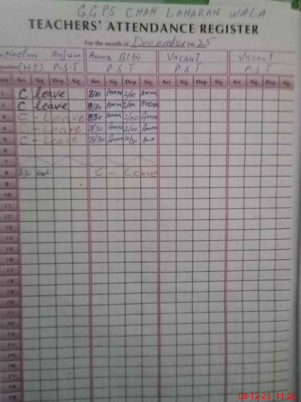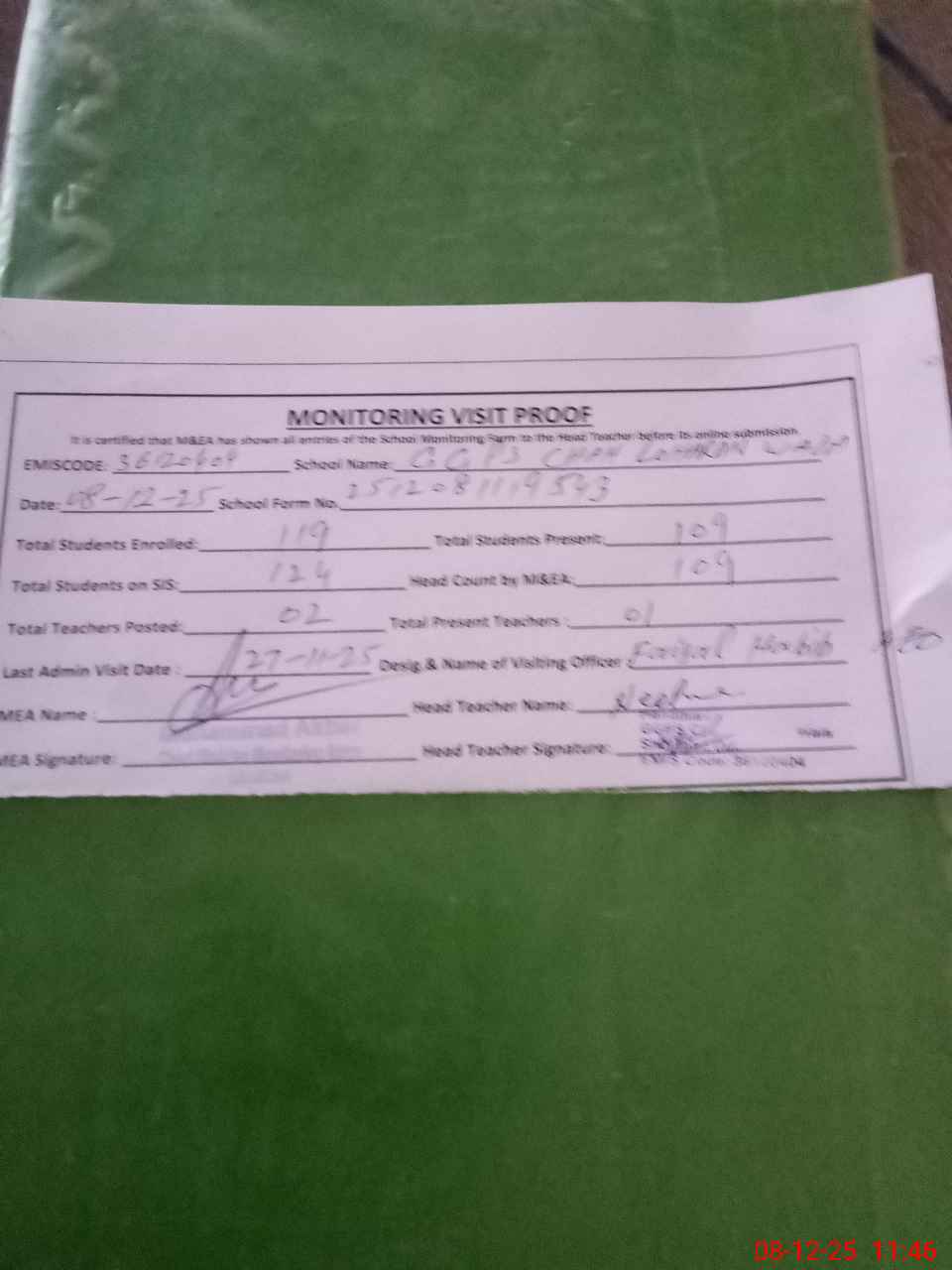 | Attendance Register | Head Teacher | MEA with School | Visit Proof |