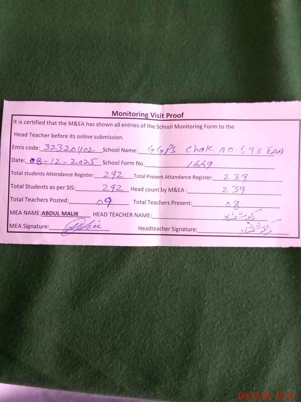 | Attendance Register | Head Teacher | MEA with School | Visit Proof |