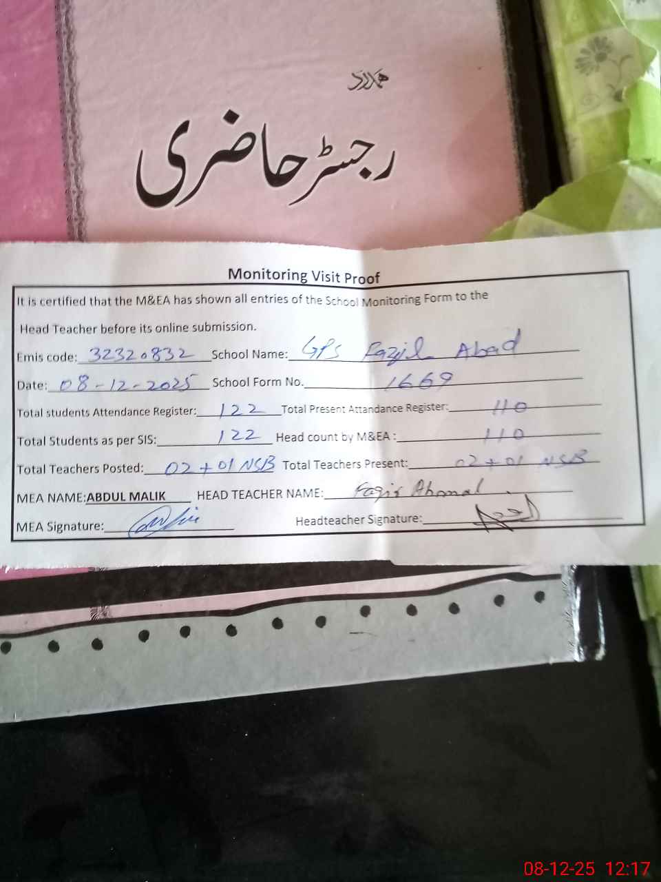 | Attendance Register | Head Teacher | MEA with School | Visit Proof |