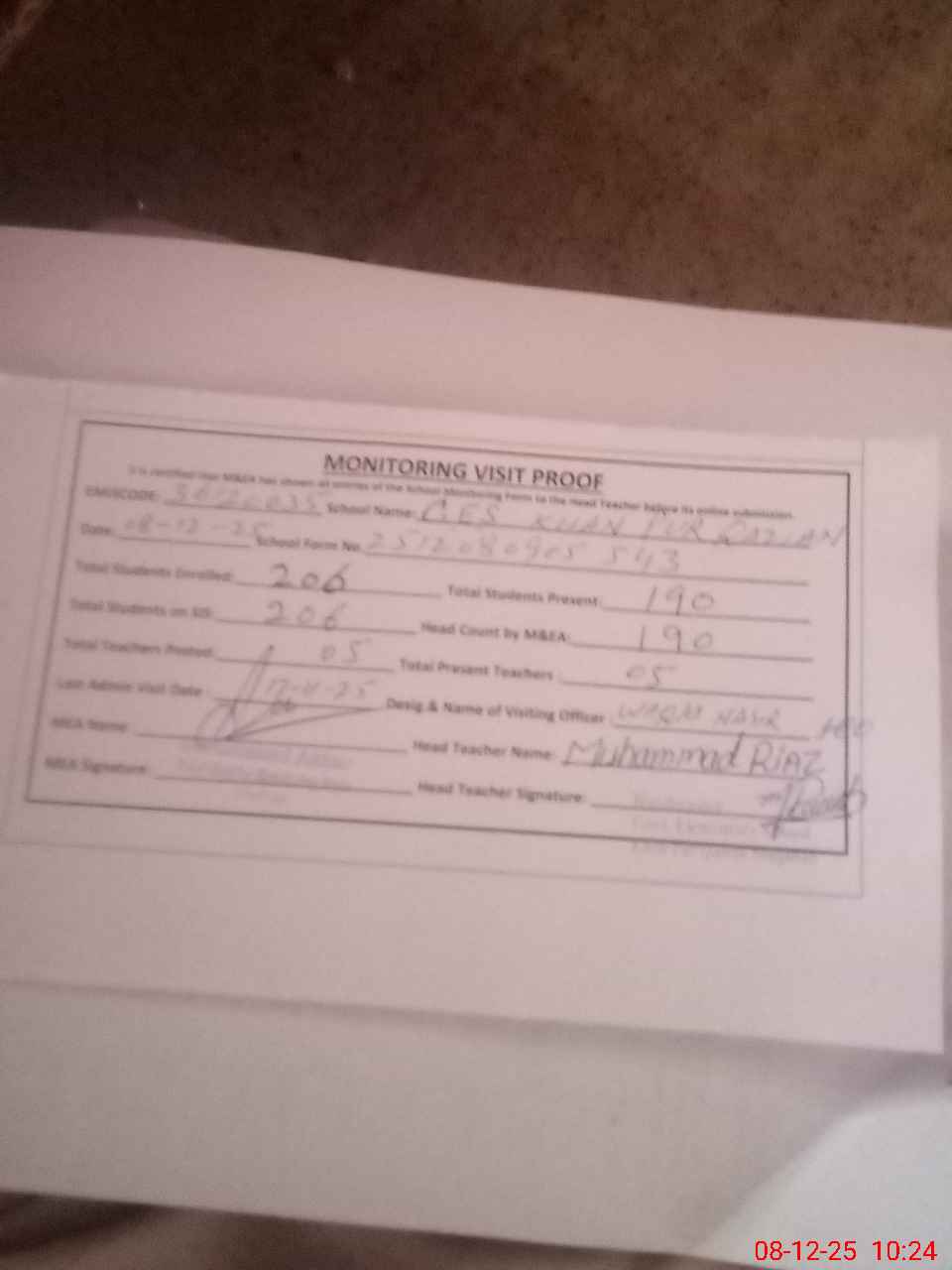 | Attendance Register | Head Teacher | MEA with School | Visit Proof |
