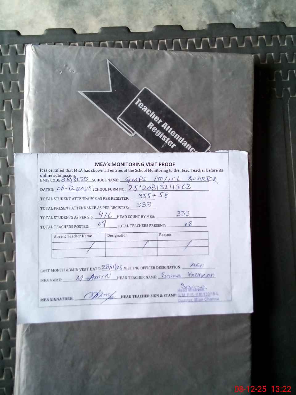 | Attendance Register | Head Teacher | MEA with School | Visit Proof |