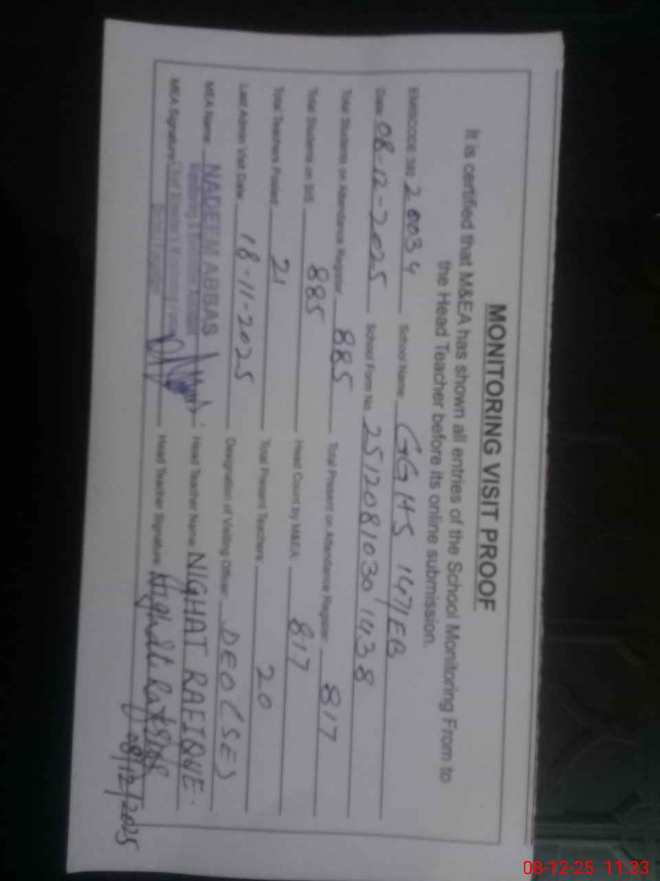 | Attendance Register | Head Teacher | MEA with School | Visit Proof |