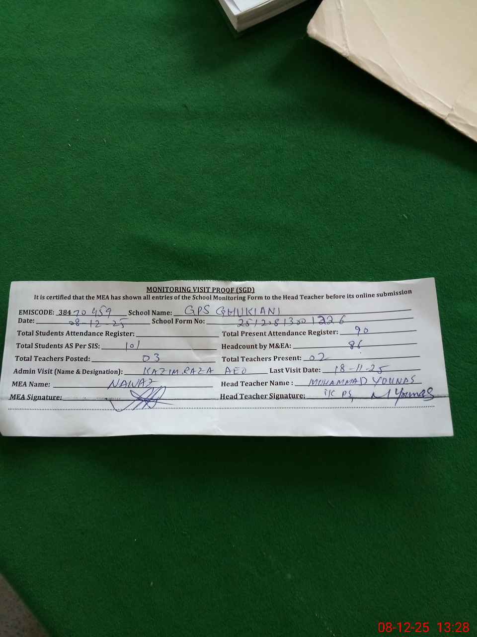| Attendance Register | Head Teacher | MEA with School | Visit Proof |