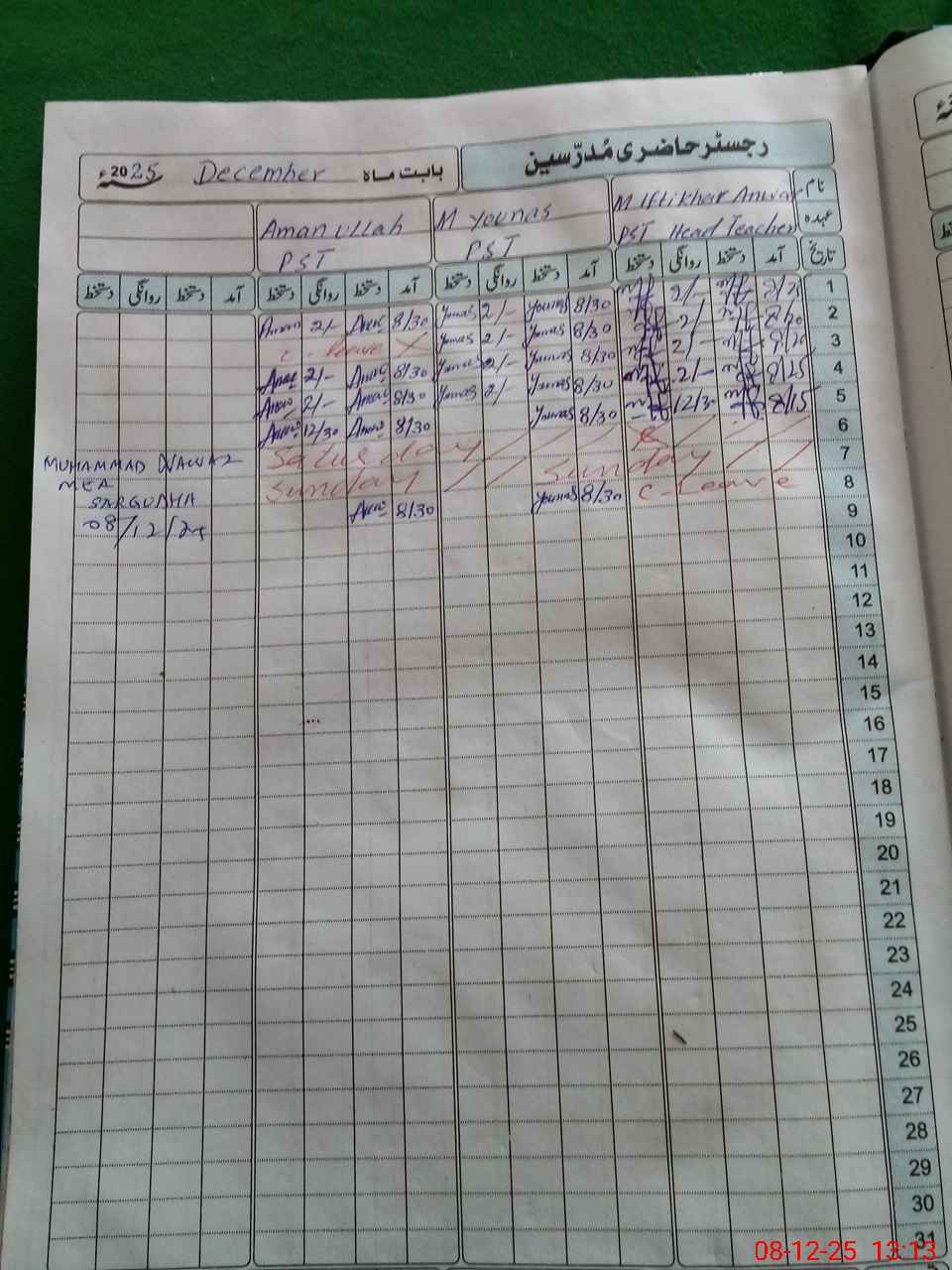 | CNIC | Full Name | Designation | R/C | Absence During Last Calender Month |