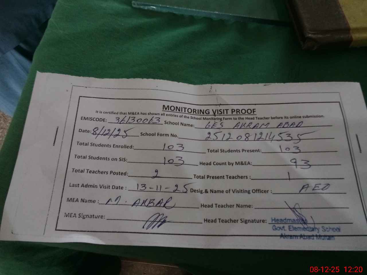 | Attendance Register | Head Teacher | MEA with School | Visit Proof |