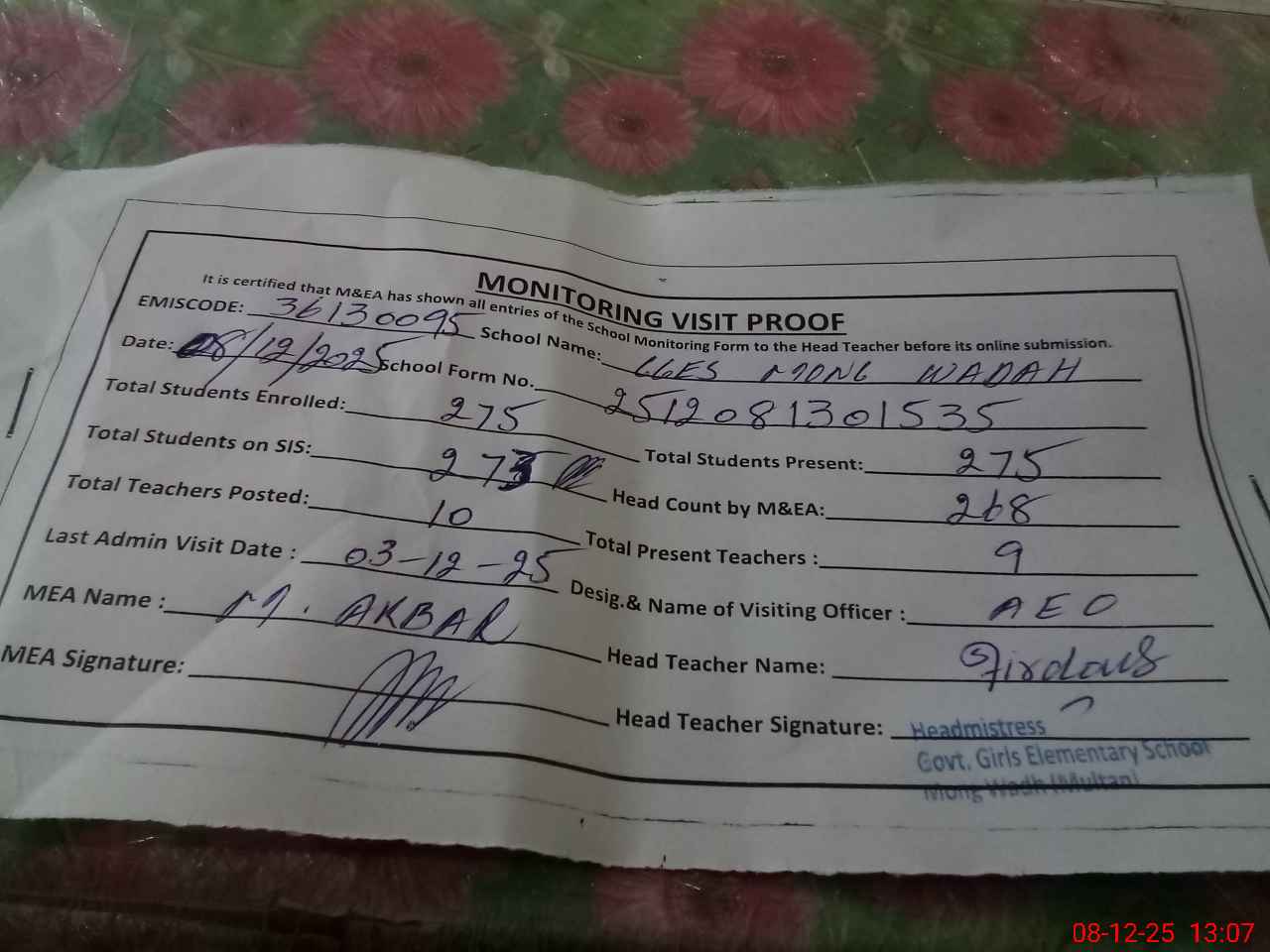 | Certified that this School was Inspected by the Undersigned MEA/DMO Today and the Information Stated Above is as Per Record. | |||||