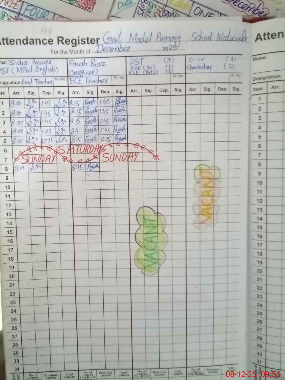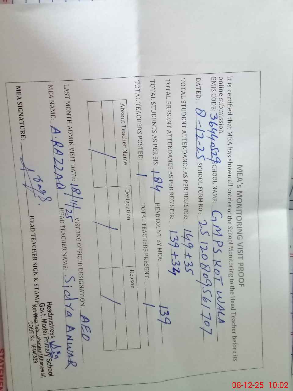 | Attendance Register | Head Teacher | MEA with School | Visit Proof |