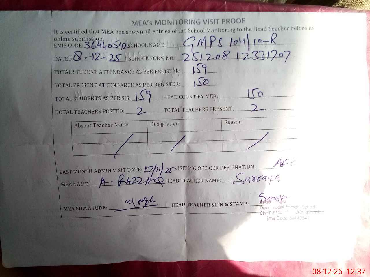 | Attendance Register | Head Teacher | MEA with School | Visit Proof |