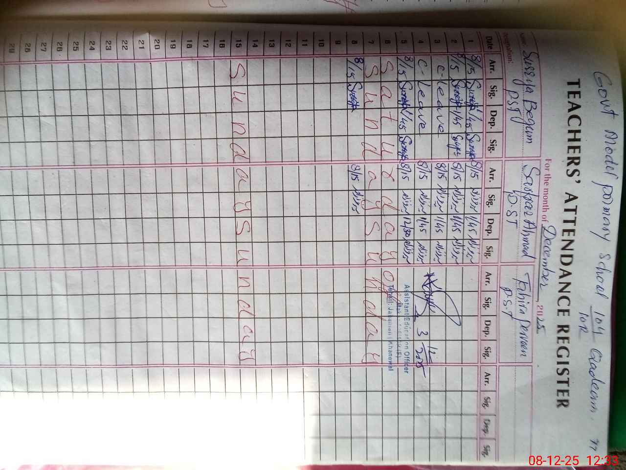 | Name: SU**** BE**** Designation: (School Headmaster's/Headmistress's) PST Phone/Cell Number: 03**** |