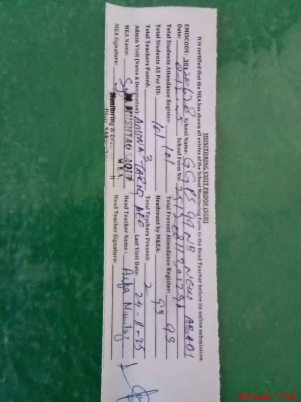 | Attendance Register | Head Teacher | MEA with School | Visit Proof |