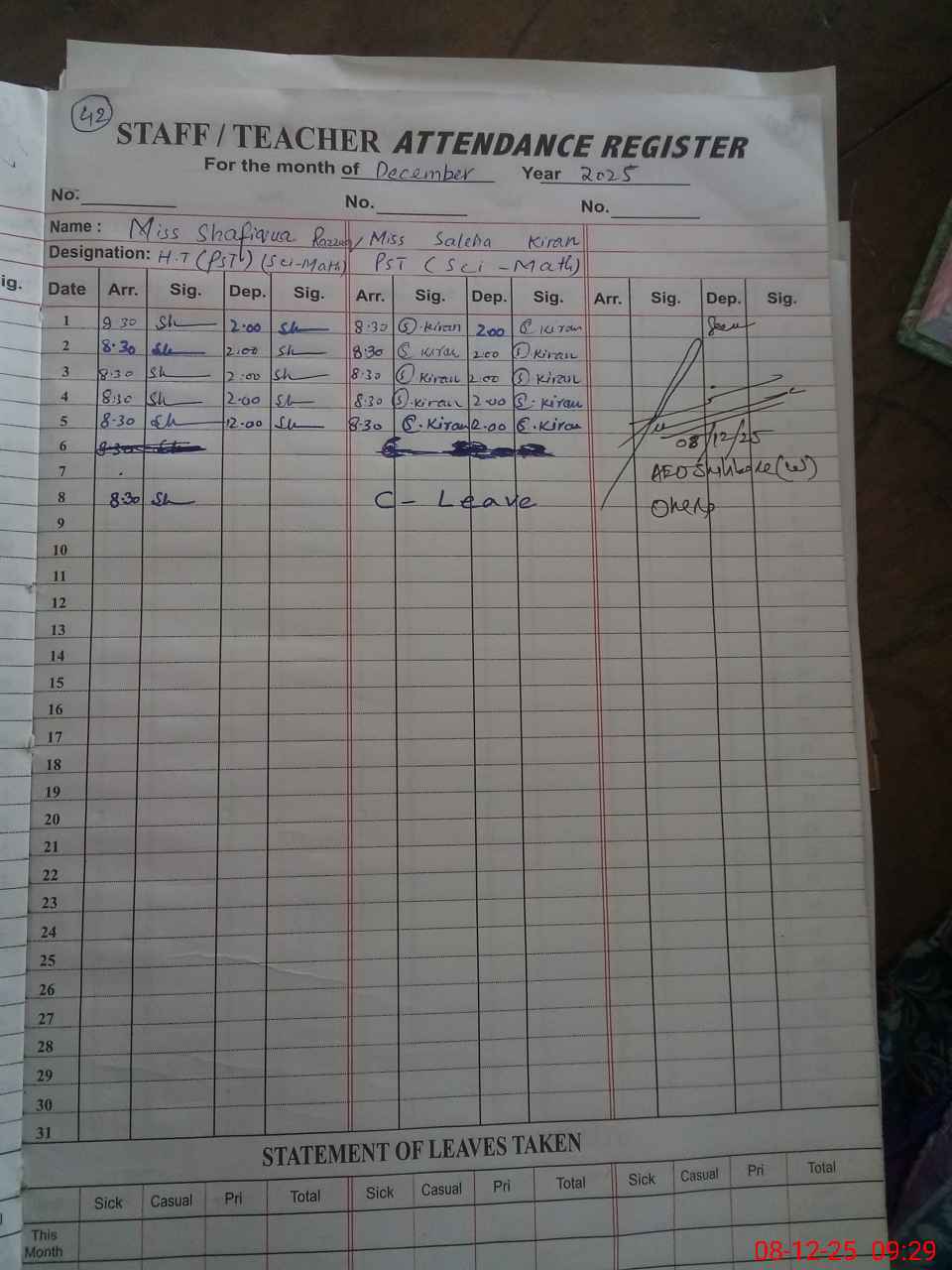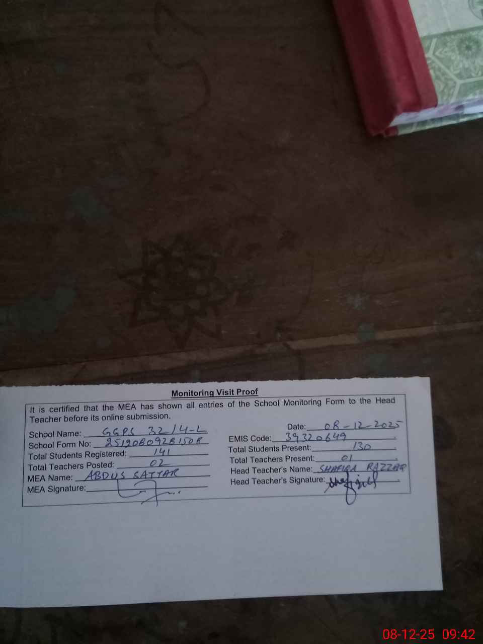 | Attendance Register | Head Teacher | MEA with School | Visit Proof |