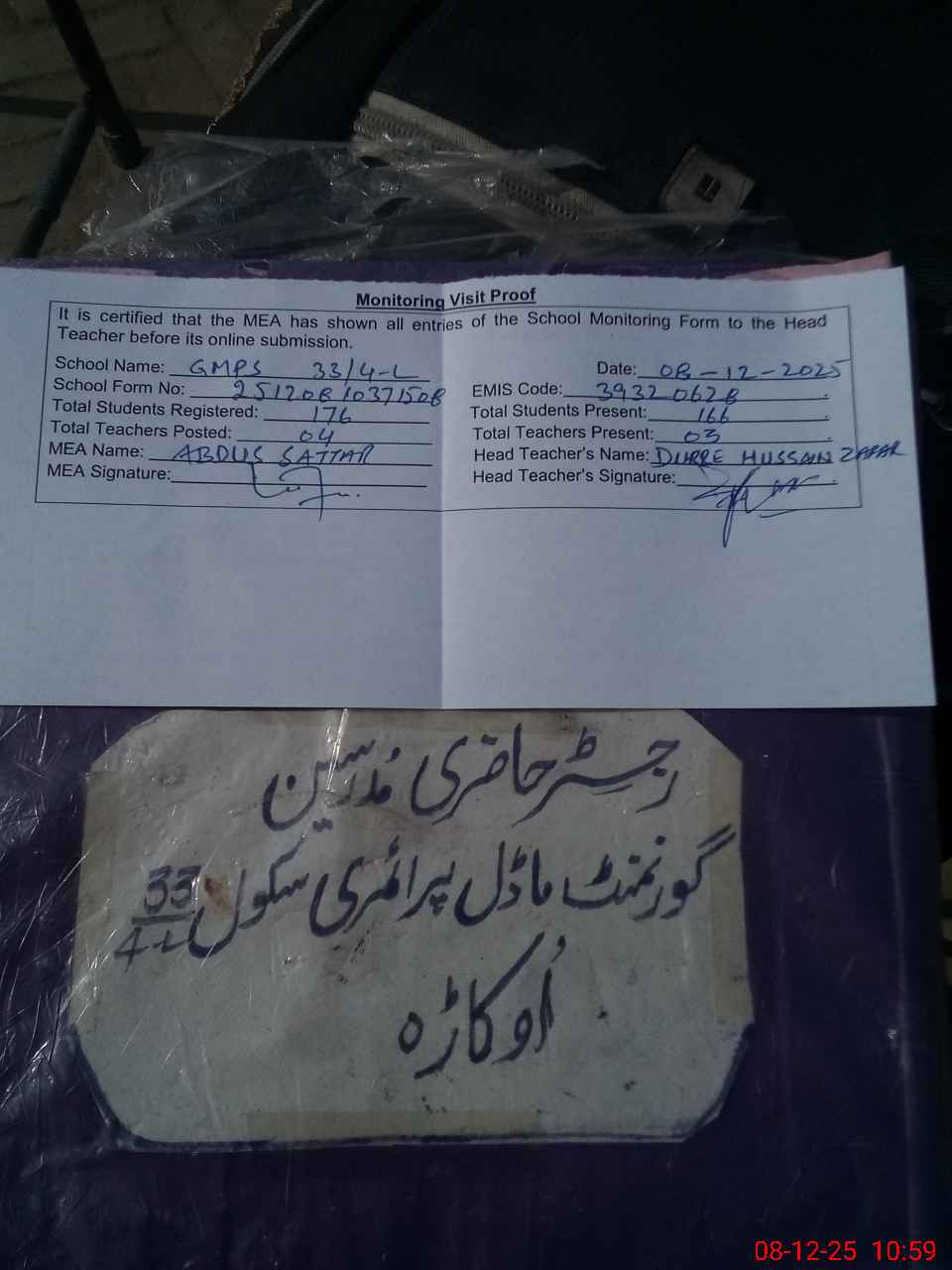 | Attendance Register | Head Teacher | MEA with School | Visit Proof |