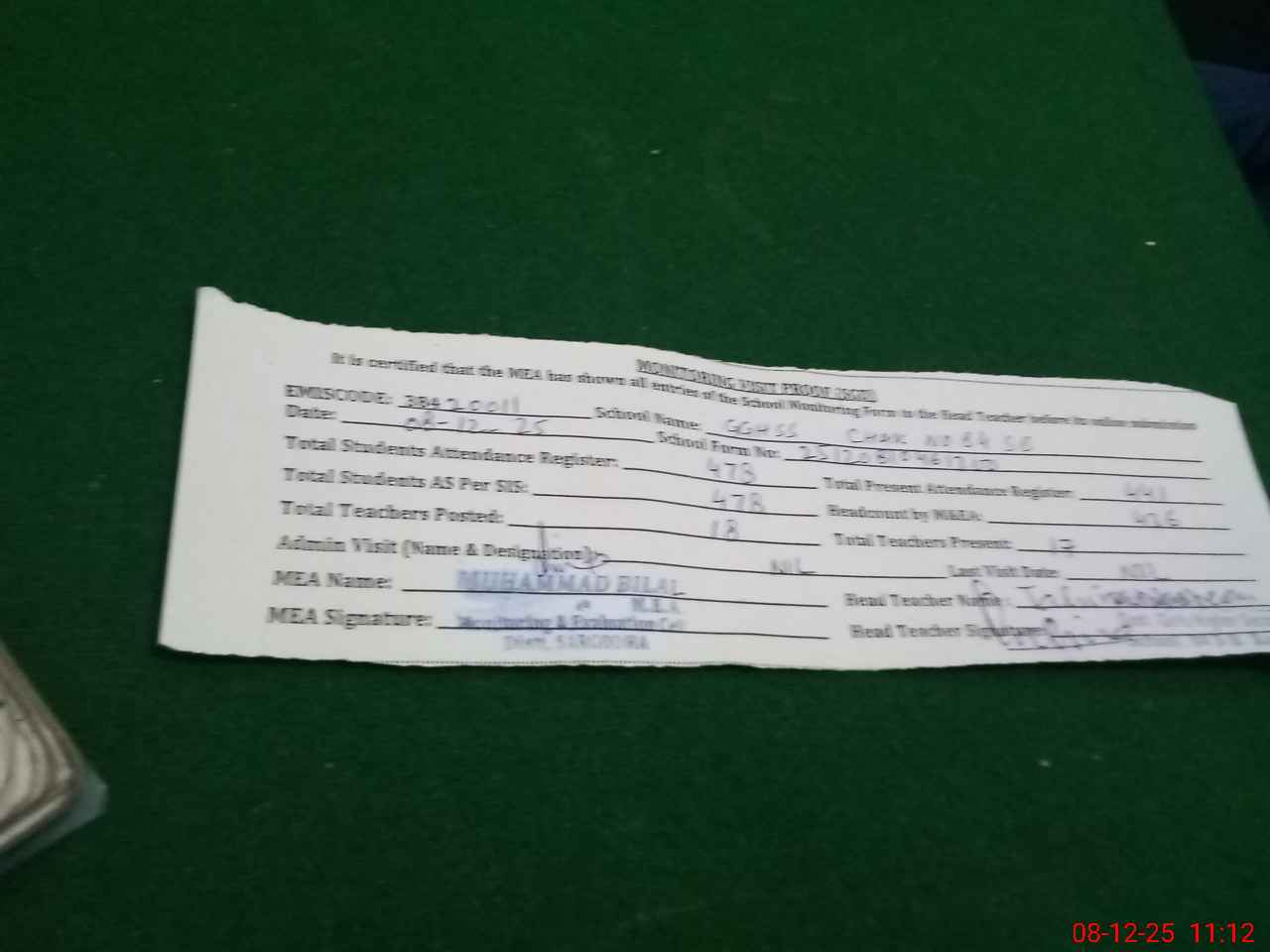 | Attendance Register | Head Teacher | MEA with School | Visit Proof |