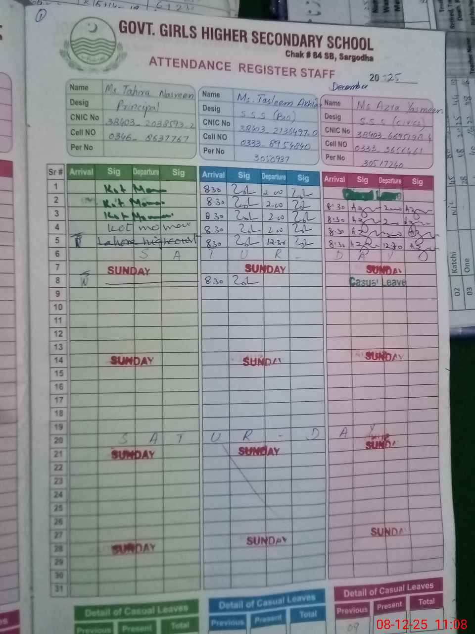 | CNIC | Full Name | Designation | R/C | Absence during last cal. month |
