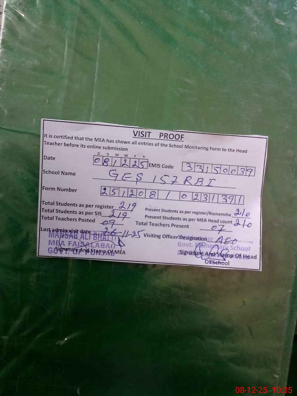 | Attendance Register | Head Teacher | MEA with School | Visit Proof |