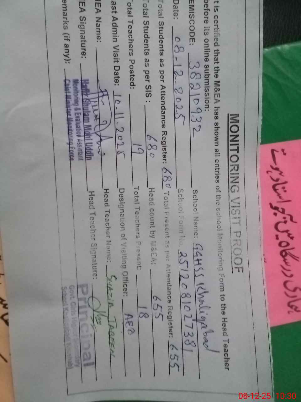 | Attendance Register | Head Teacher | MEA with School | Visit Proof |