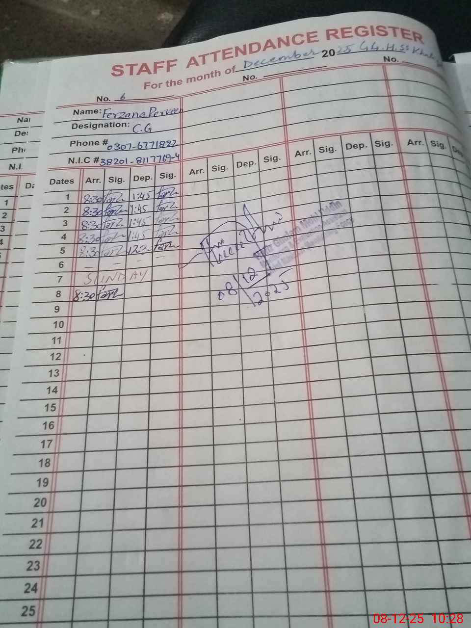 | CNIC | Full Name | Designation | R/C | Absence during last cal. month |
