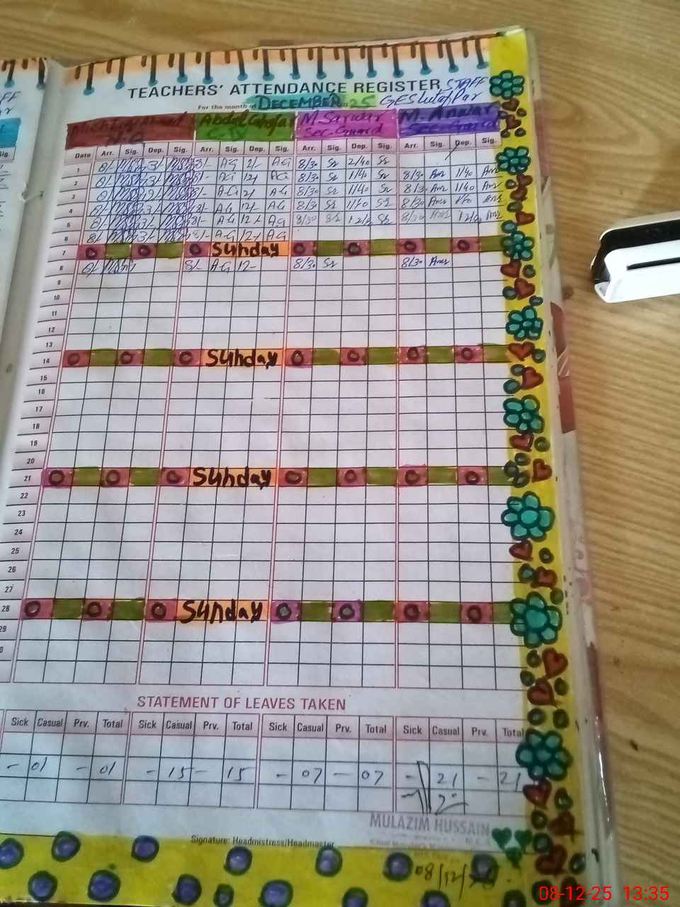 | CNIC | Full Name | Designation | R/C | Absence During Last Calender Month |