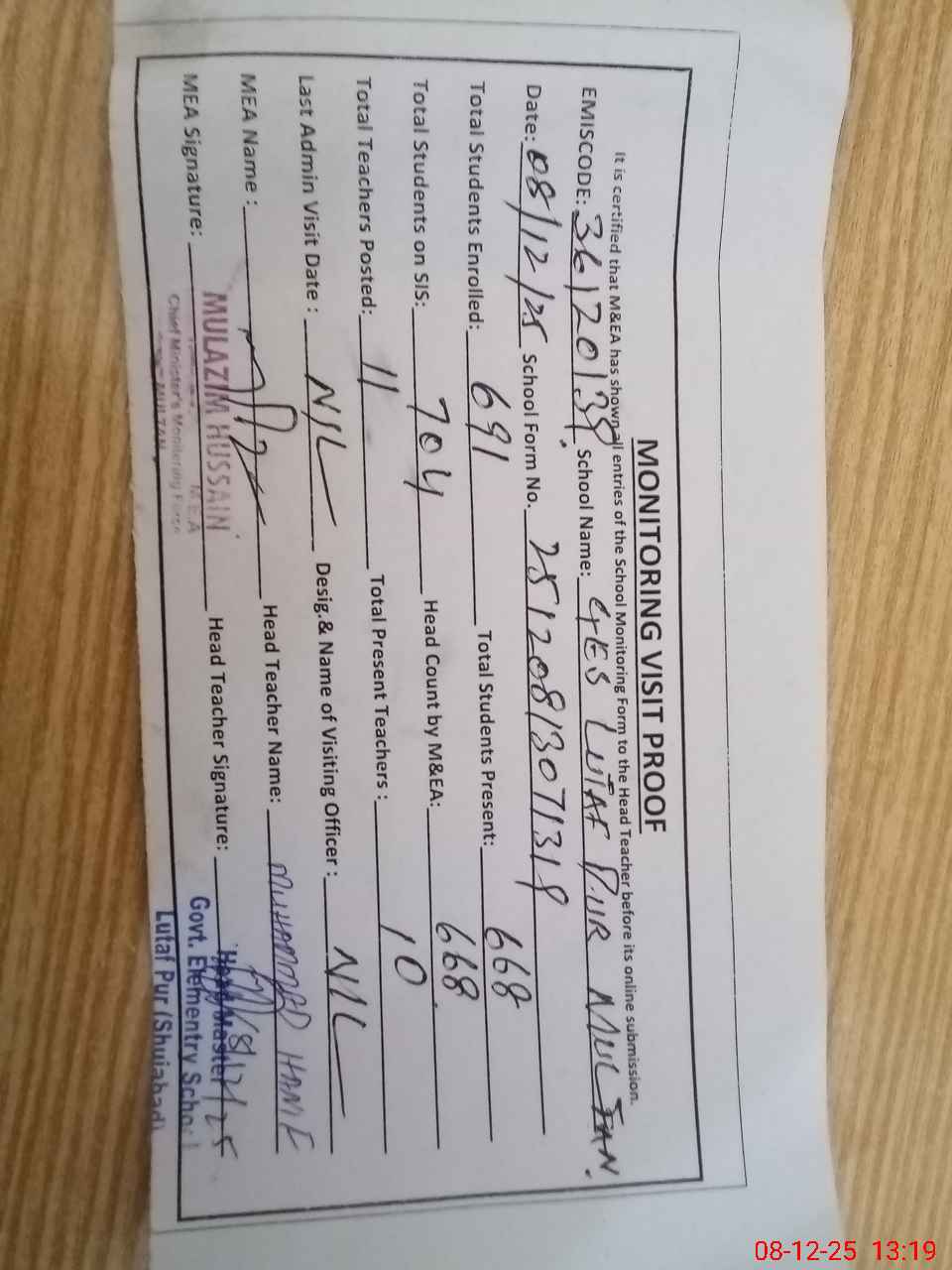 | Attendance Register | Head Teacher | MEA with School | Visit Proof |