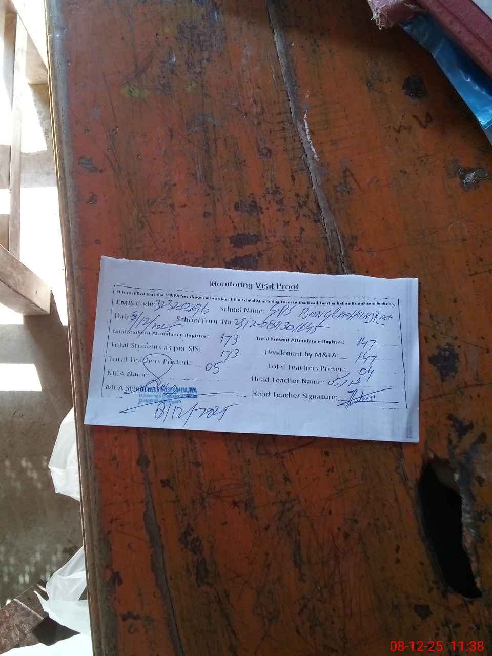 | Attendance Register | Head Teacher | MEA with School | Visit Proof |