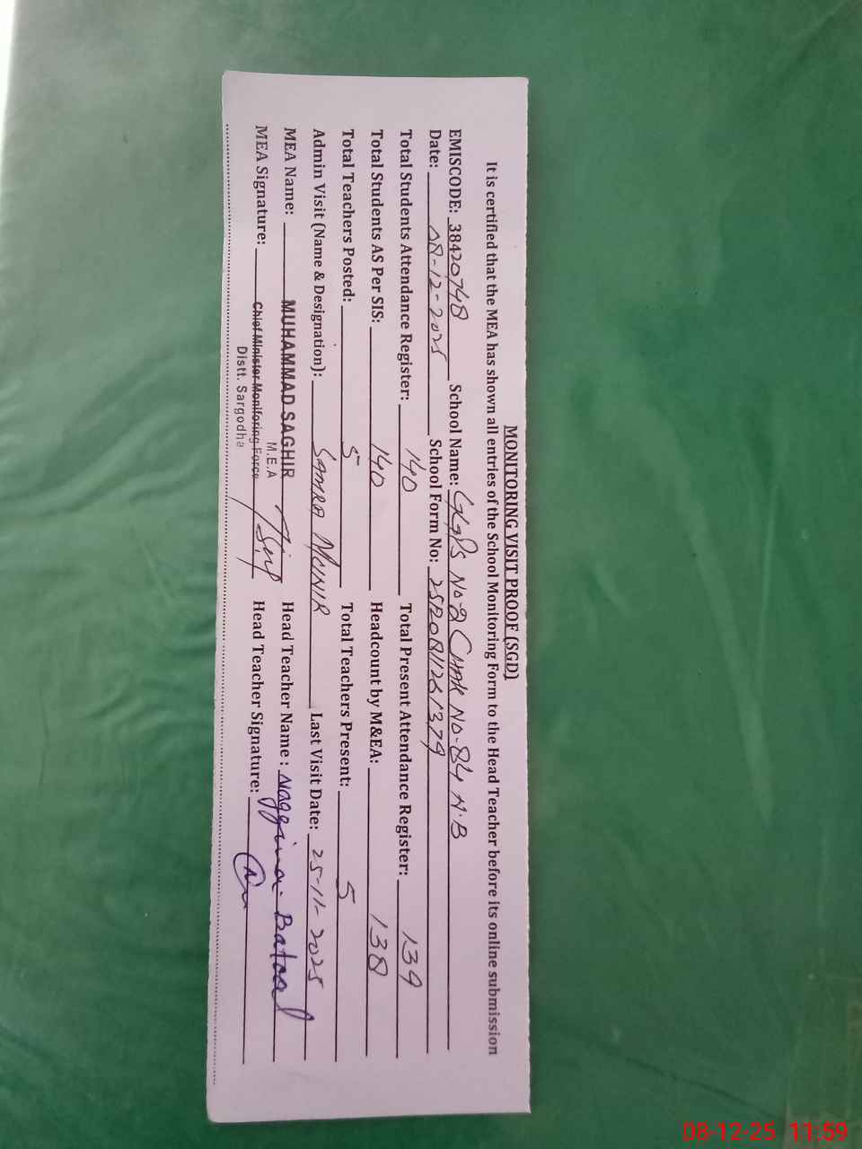 | Attendance Register | Head Teacher | MEA with School | Visit Proof |