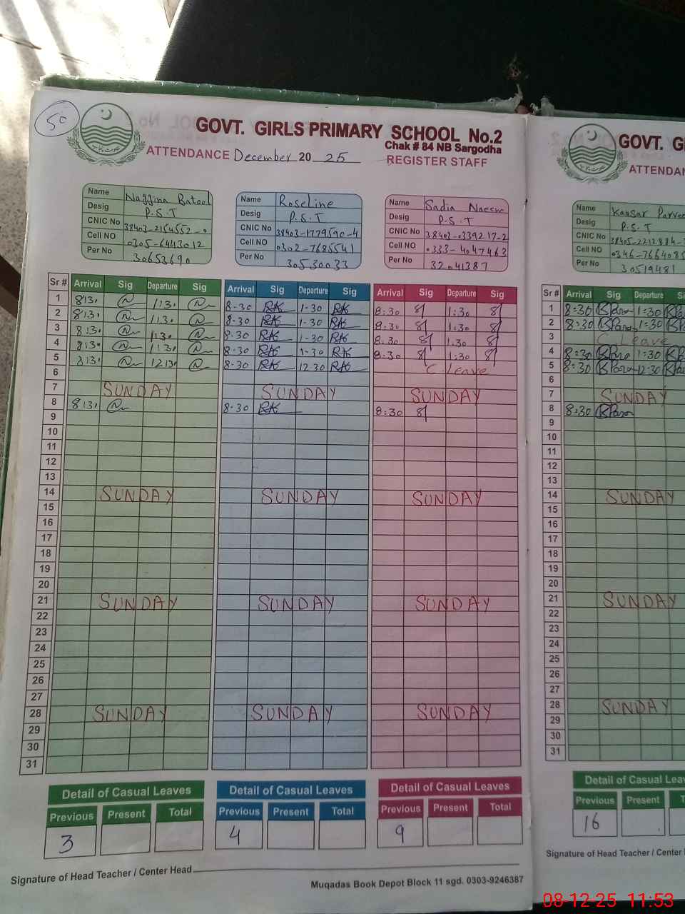 | CNIC | Full Name | Designation | R/C | Absence During Last Calender Month |