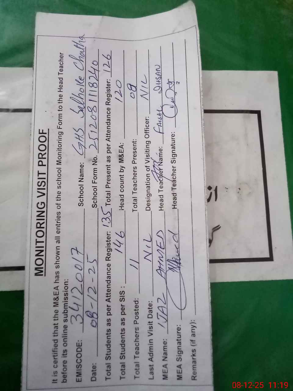 | Attendance Register | Head Teacher | MEA with School | Visit Proof |