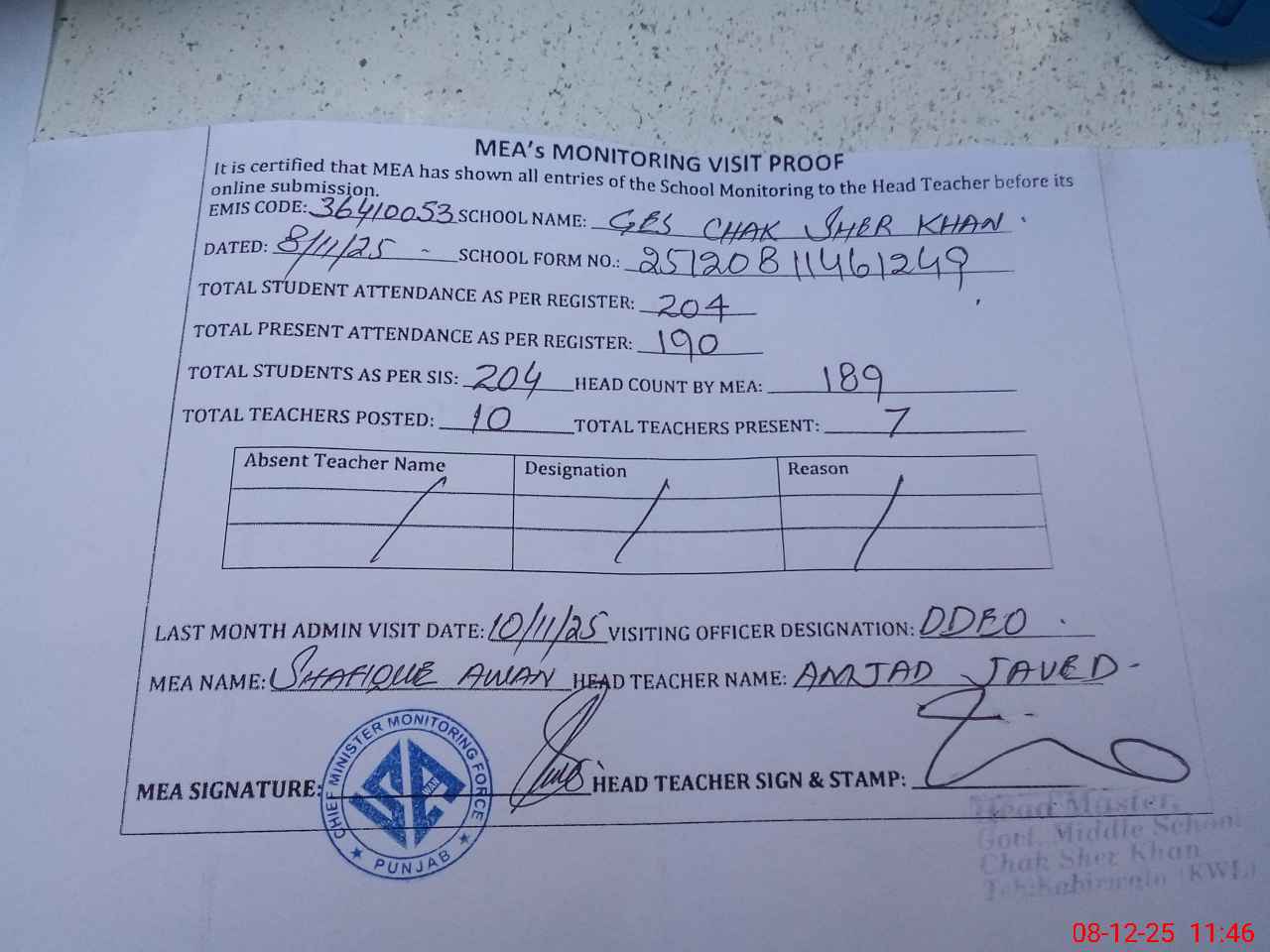 | EMIS Code: 36410053 | Name of School: GES CHAK SHER KHAN, KABIRWALA | |||