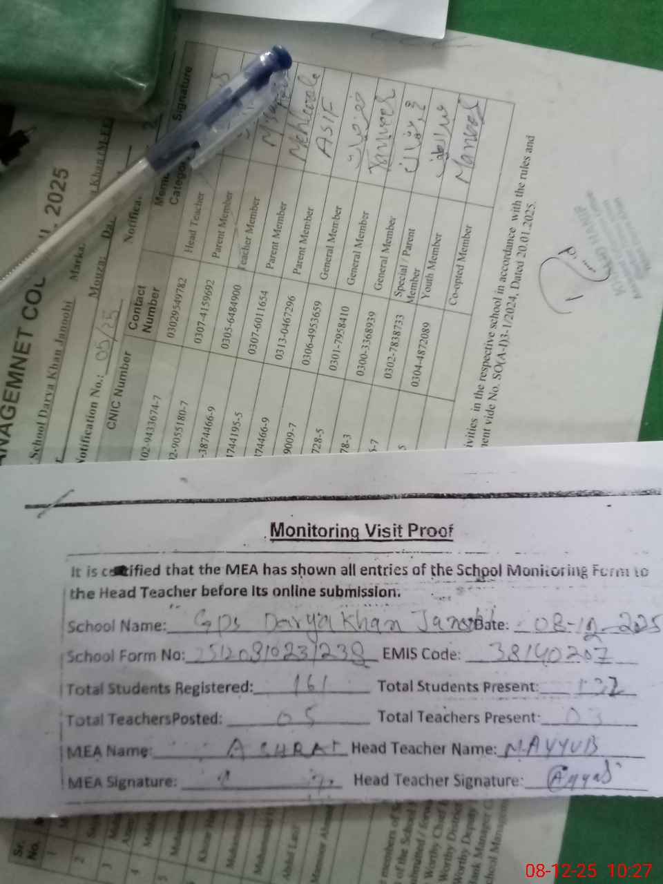 | Attendance Register | Head Teacher | MEA with School | Visit Proof |