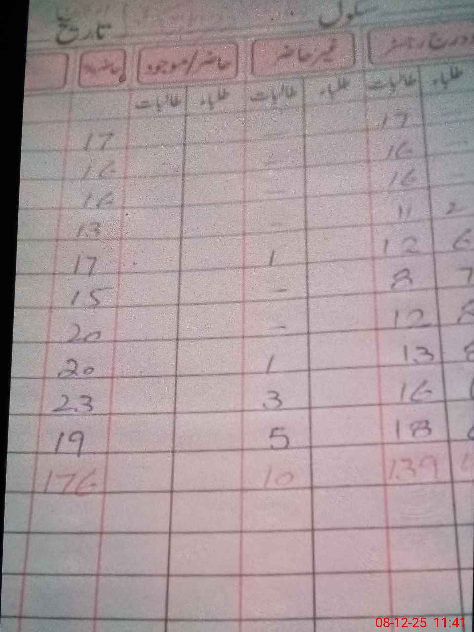 | No. of Students Present - Female | 0 | 15 | 13 | 10 | 8 | 11 | 10 | 15 | 16 | 17 | 131 | |||||