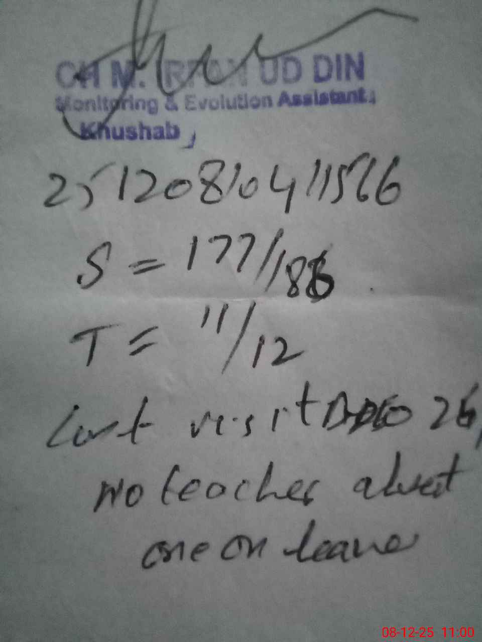 | Remarks (Use Separate Page if Required): gges uchala student on sis 186 student on register 186 head count 177 no teacher absent one on leave last visit ddeo 26/11/25 class room required | |||||