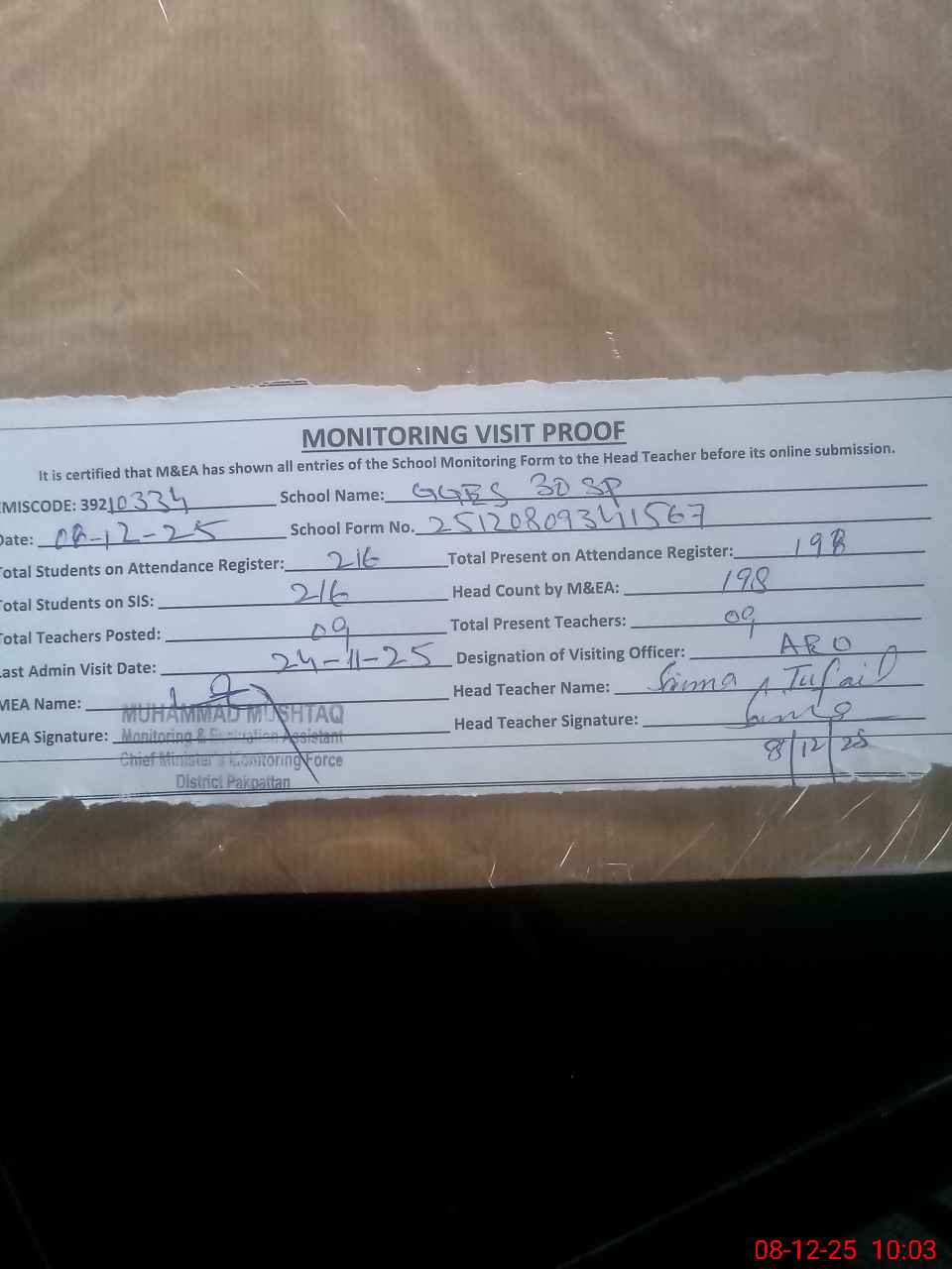 | Attendance Register | Head Teacher | MEA with School | Visit Proof |