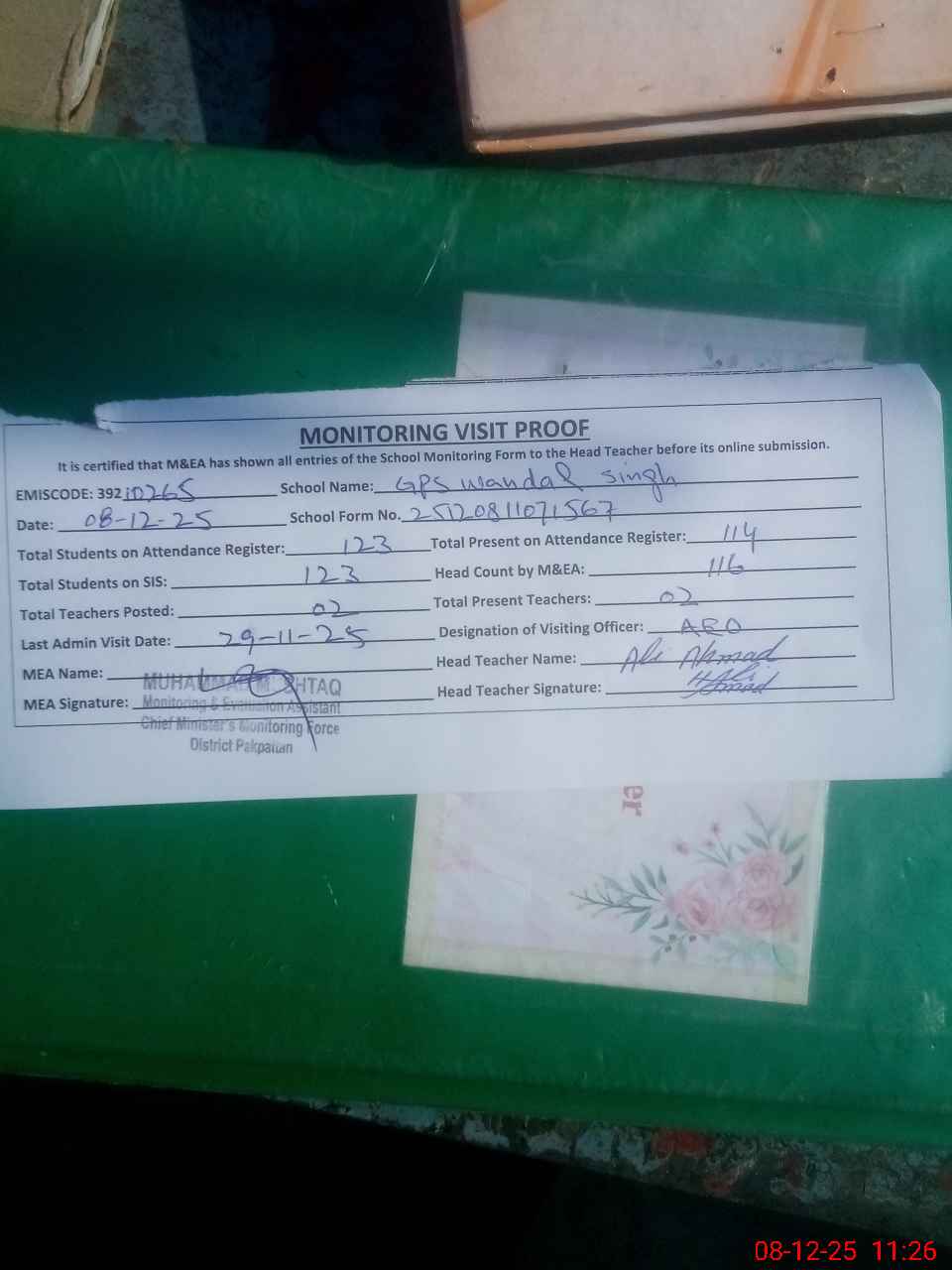 | Attendance Register | Head Teacher | MEA with School | Visit Proof |
