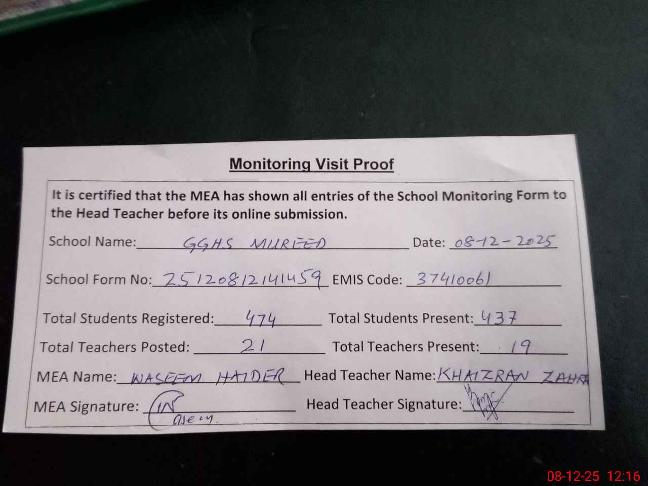 | Attendance Register | Head Teacher | MEA with School | Visit Proof |