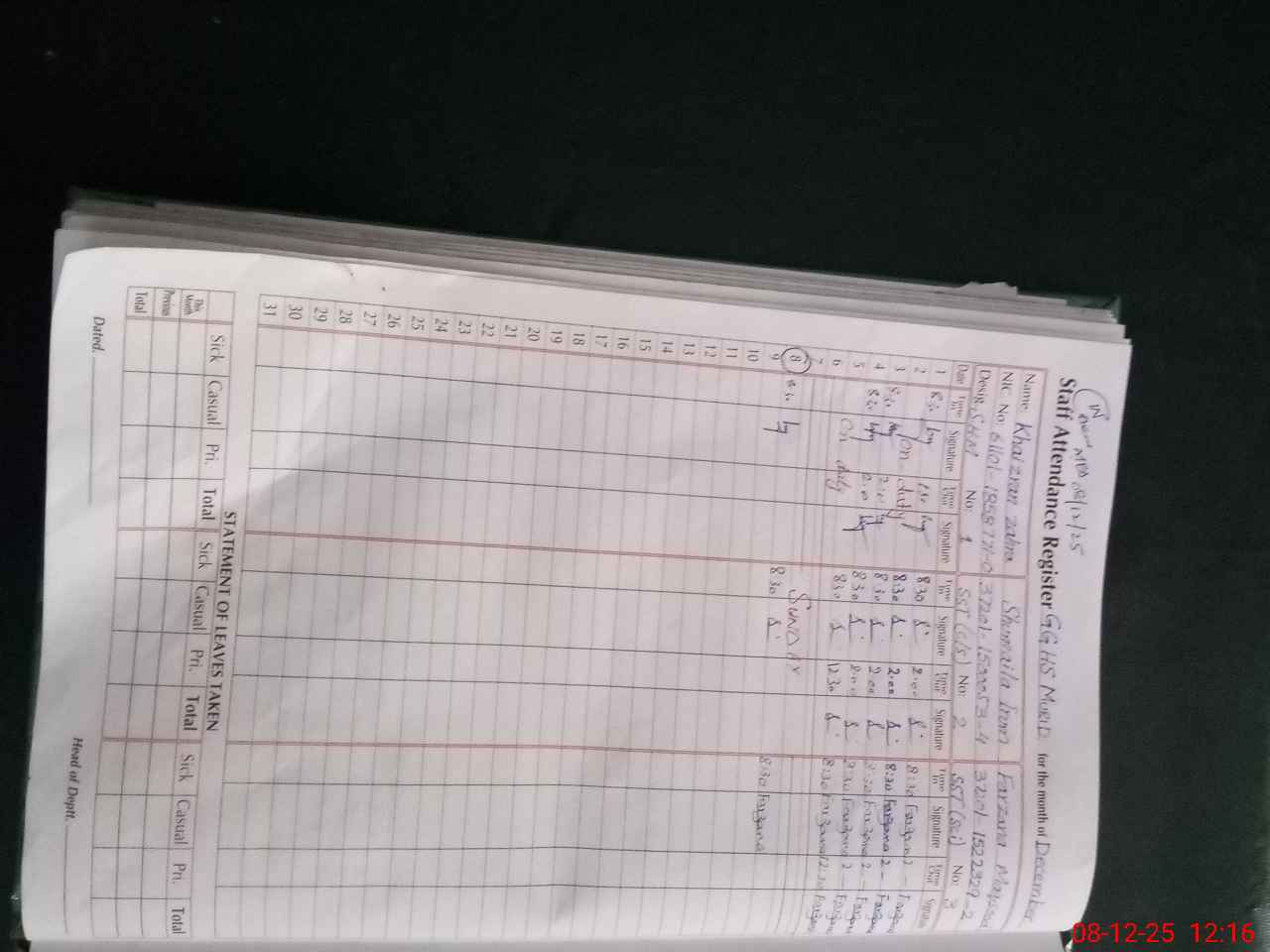 | CNIC | Full Name | Designation | R/C | Absence During Last Calender Month |