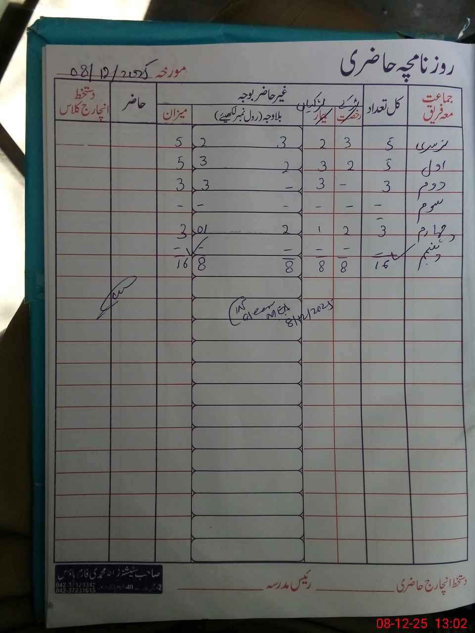 | Total Students Present | 0 | 0 | 5 | 3 | 0 | 3 | 0 | 16 | ||||||||
