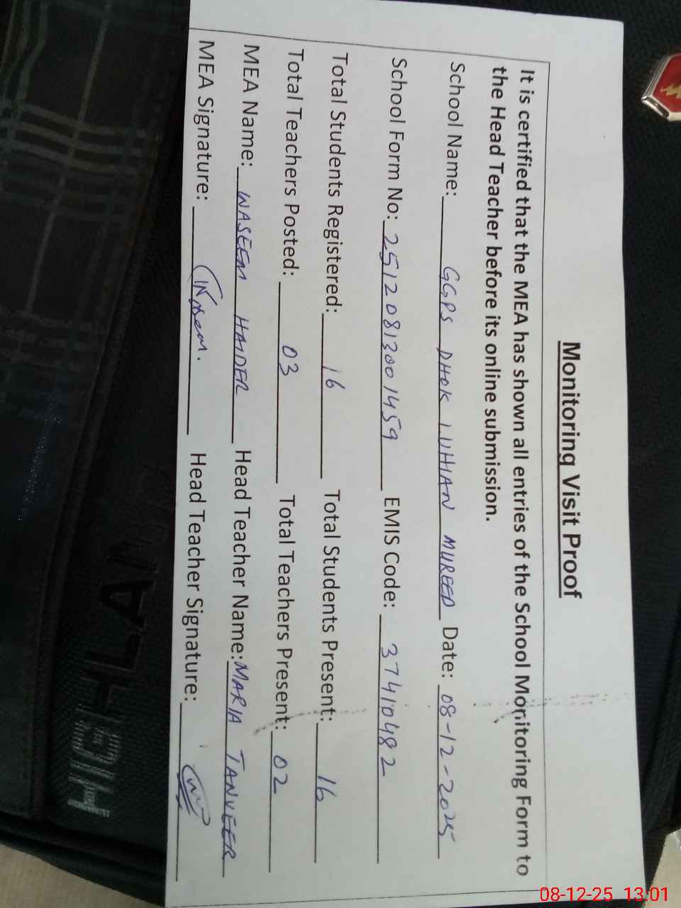 | Attendance Register | Head Teacher | MEA with School | Visit Proof |