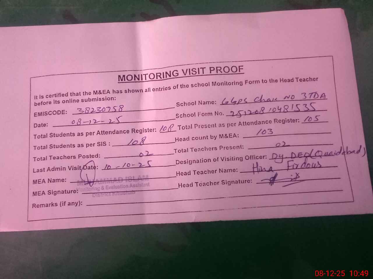 | Remarks (Use Separate Page if Required): Dy DEO visited school on 10 October 2025 Students strength on sis 108 | |||||
