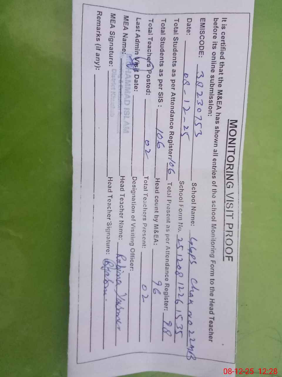 | Remarks (Use Separate Page if Required): DEO visited school on 3 December 2025 Students strength on sis 106 | |||||