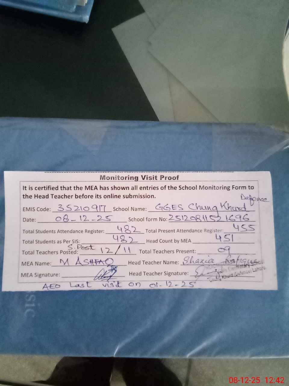 | Attendance Register | Head Teacher | MEA with School | Visit Proof |