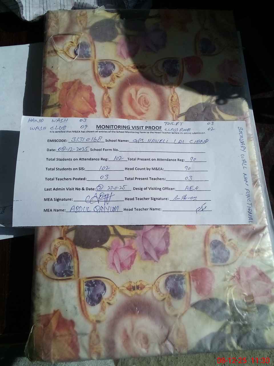 | Attendance Register | Head Teacher | MEA with School | Visit Proof |