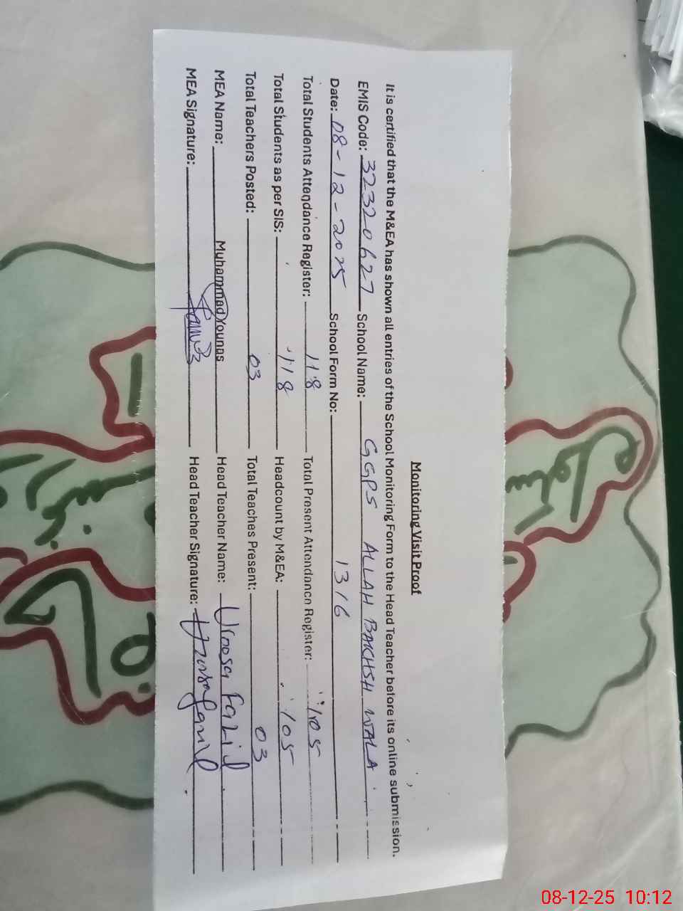 | Attendance Register | Head Teacher | MEA with School | Visit Proof |