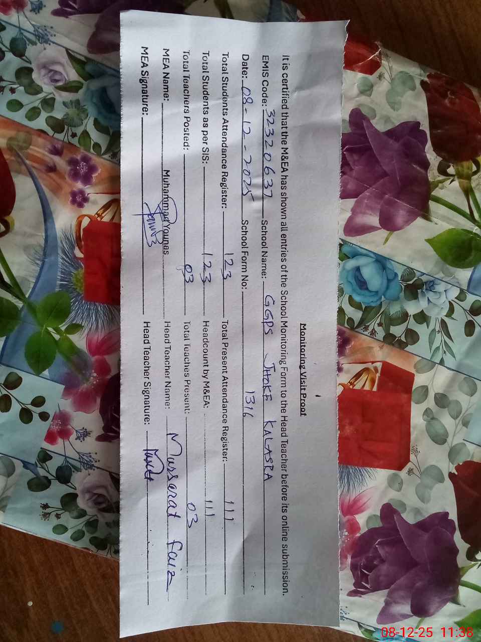 | Attendance Register | Head Teacher | MEA with School | Visit Proof |