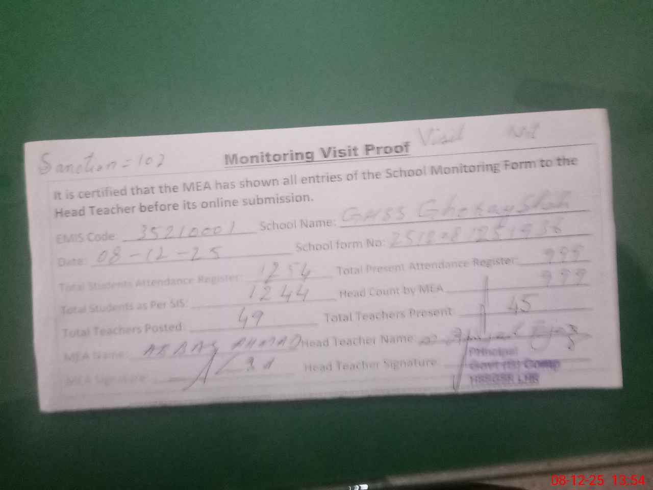 | Attendance Register | Head Teacher | MEA with School | Visit Proof |