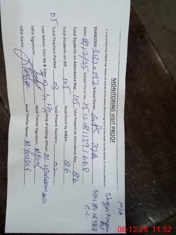 | Monitoring Date: 08-12-2025 | Start Time: 08-12-2025 11:39 AM | End Time: 08-12-2025 11:53 AM | Name of MEA: Za**** Iq**** | |