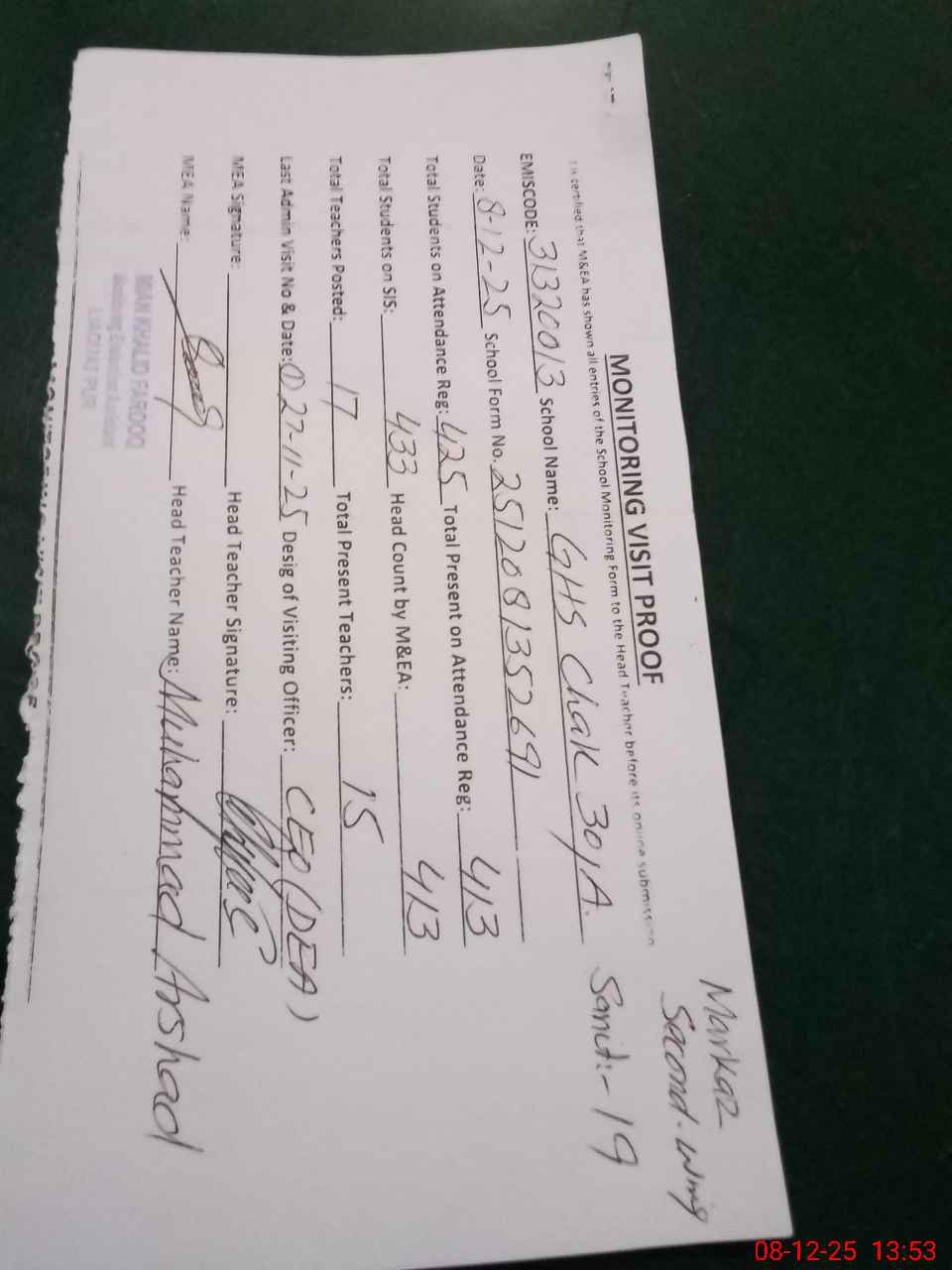| Name: MU**** AR**** Designation: (School Headmaster's/Headmistress's) SST. ( I/C) Phone/Cell Number: 03**** |